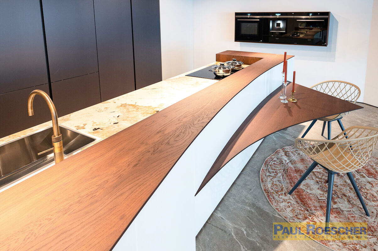 Zelden hebben wij zo'n unieke "juweelkeuken" mogen presenteren in het luxe segment van onze keukenshowroom, genaamd "Suprematie". De vloeiende ronde lijnen contrasteren op elegante wijze met strakke elementen, waarbij het opvallende marmeren werkblad en het speelse zit-/eetgedeelte direct in het oog springen. Het dunne, maar solide handgemaakte houten werkblad straalt pure klasse uit.